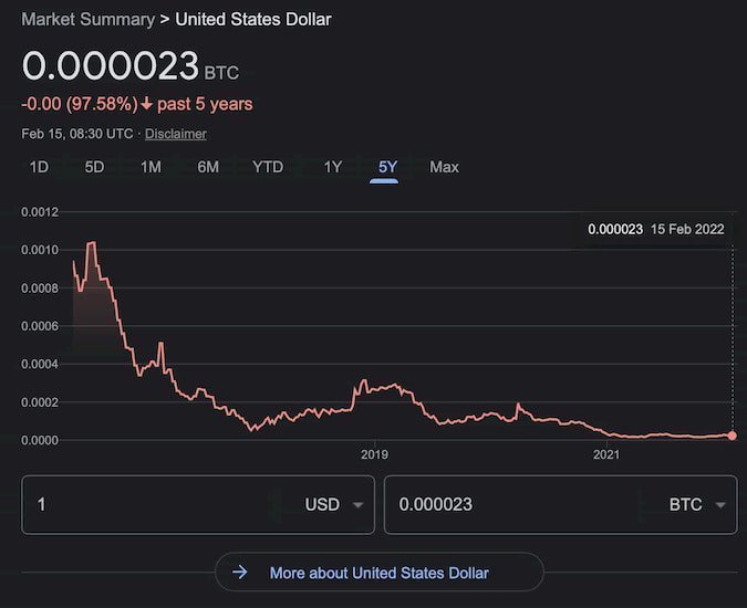 15 Şubat 2022 Salı günü itibariyle ABD Doları, son beş yılda Bitcoin’e göre satın alma gücünün %97,58’ini kaybetti. Bu nedenle, bir doların değerini Bitcoin ile karşılaştırırken, 1 USD artık sadece 0.000023 BTC değerinde.