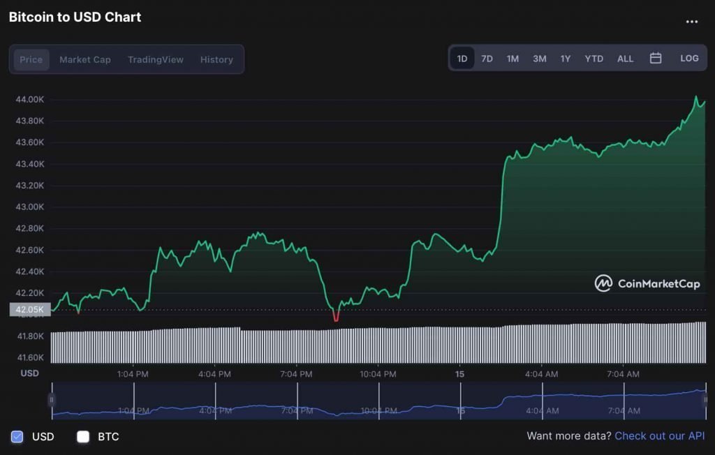 CoinMarketCap verilerine göre şu anda BTC, son 24 saatte %3,91 artışla ve geçen hafta %0,83 düşüşle 43,861 dolardan işlem görüyor.